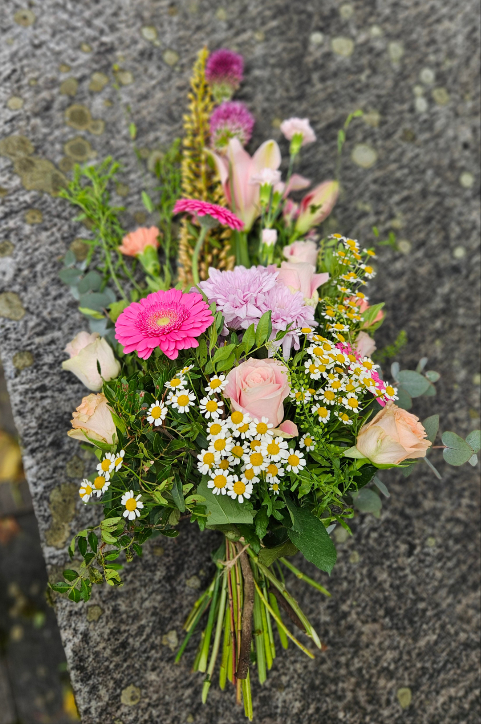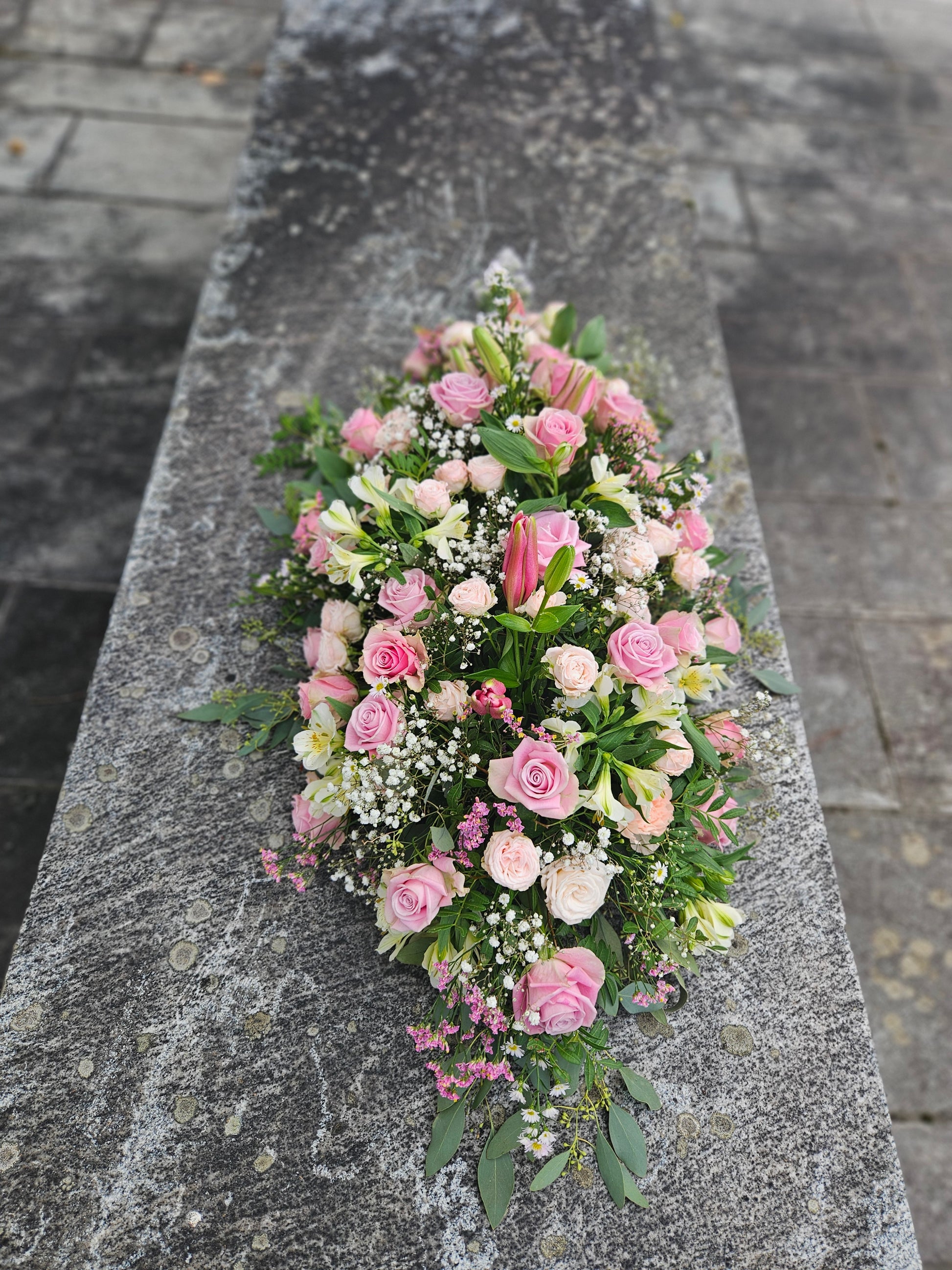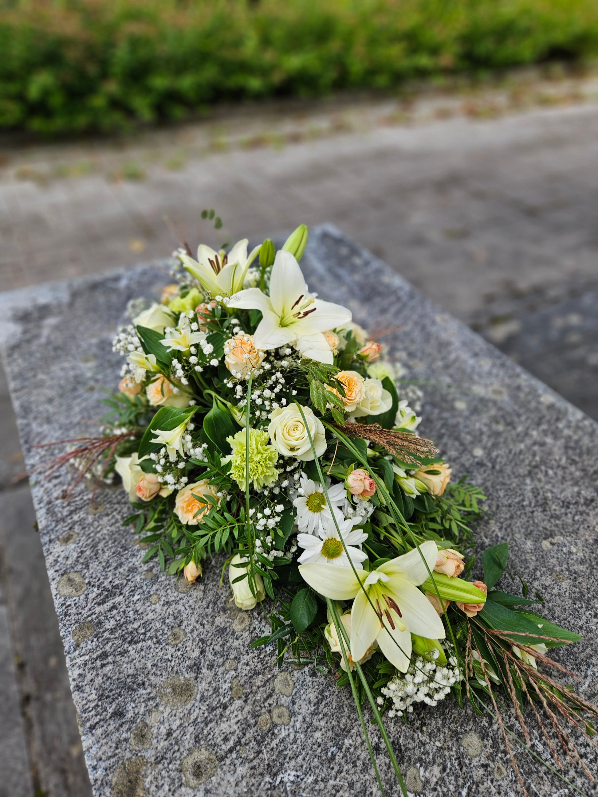 Bestillast av naboar og slektningar. Ligg ikkje på kista. Sløyfe og frakt til kyrkja er inkludert i prisen. Skriv sløyfetekst på eige felt i handlekorga.