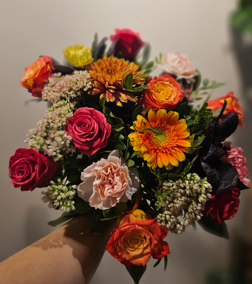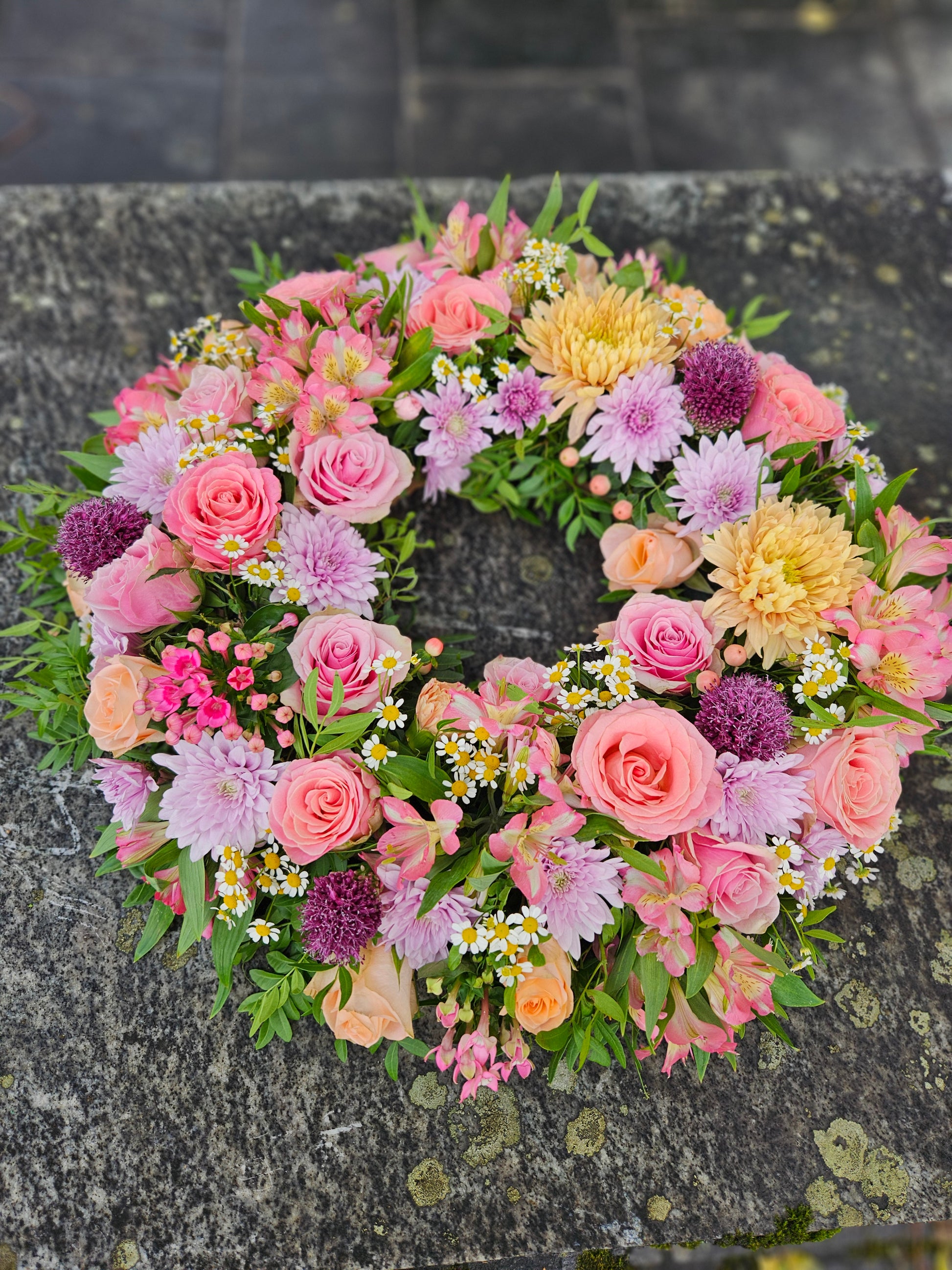 Bestillast av nær familie og naboar (felles krans frå fleire naboar). Sløyfe og frakt til kyrkja er inkludert i prisen. Skriv sløyfetekst på eige felt i handlekorga.