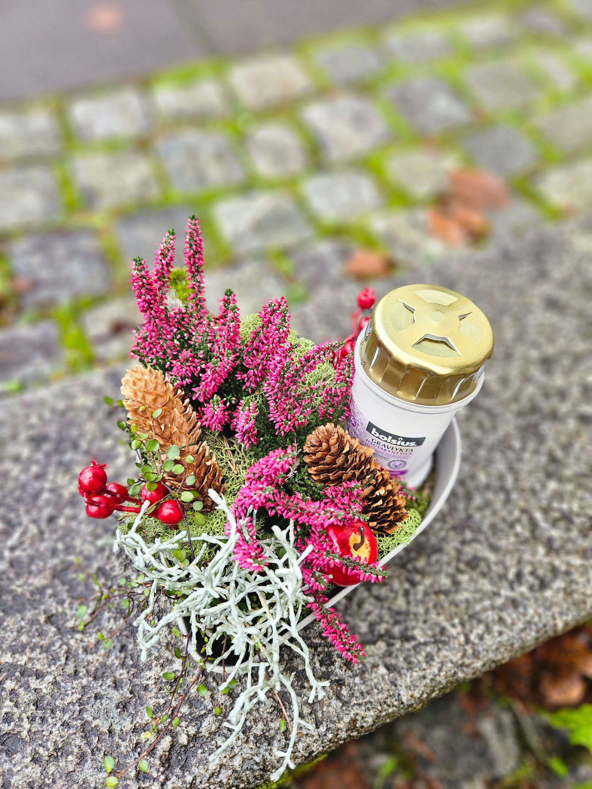 Gravpynt i hjerteskål med lys